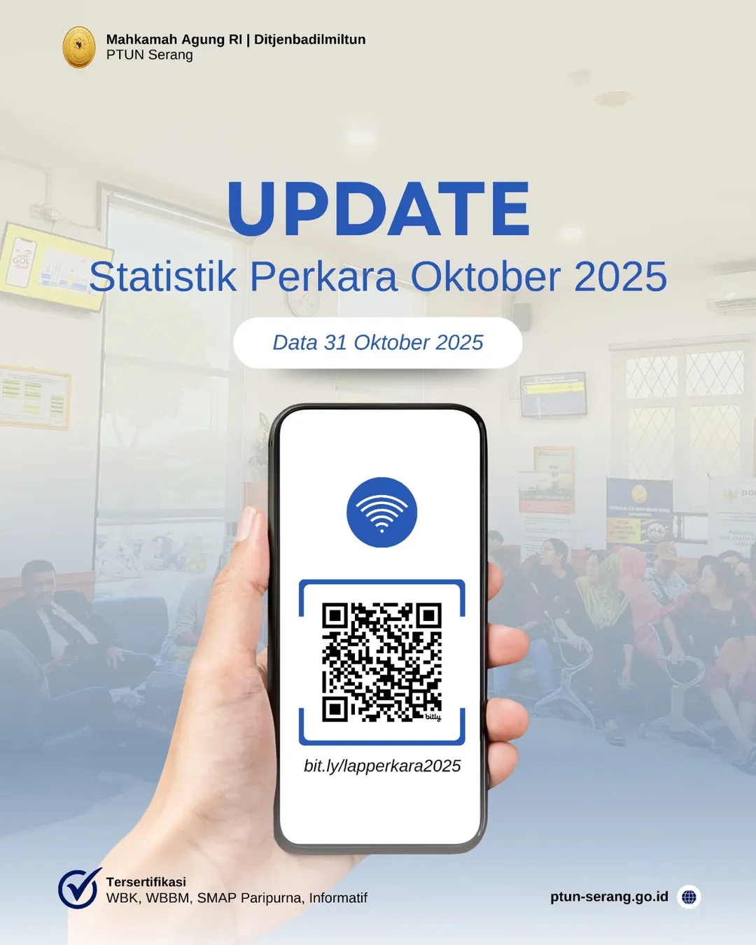 Silakan scan QR code pada postingan ini atau akses melalui tautan: bit.ly/lapperkara2025 untuk melihat laporan lengkap Statistik Perkara PTUN Serang Oktober 2025.